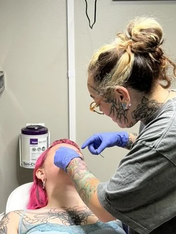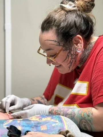 Hello! My name’s Michelle and I’ve been piercing for 6 years but 8 years total in the industry. Some of my favorite piercings to do include the conch, nostril, earlobes, and eyebrows. I also enjoy piercing minors earlobes and giving them a safe environment to get pierced and be themselves. It’s incredibly important to me that everyone has an amazing experience, whether this is your first lobes or your 15th piercing! When I’m not at work, you can often find me watching “Grey’s Anatomy” or “Bobs Burgers”. You can also often find me at Arrowhead Stadium cheering on our KC Chiefs. I have 2 kids, 3 cats, and 2 dogs!
